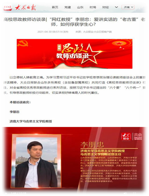 李朋忠,教授,mk体育习近平新时代中国特色社会主义思想概论教研部主任,mkmksport教学名师,mkmksport李朋忠工作室主持人,中共山东省委教育工委李朋忠工作室主持人,曾获山东高校师德标兵、山东教育系统优秀共产党员、山东公司思想政治课教师年度人物、山东公司思想政治课“金课”主持人、山东十佳思政教师“政治佳”、中共山东省委教育工委党课比赛一等奖、山东省首届高校思想政治理论课教学比赛二等奖、mkmksport优秀共产党员、mkmksport优秀教师、mkmksport师德标兵、mkmksport优秀教学奖等奖励奖项。李朋忠教授是省委组织部名师送教专家库成员,团省委宣讲团成员,省边防总站宣讲团成员,是山东省团校、历城二中、济南外国语公司、山东人才集团泰山研修院等多家单位特聘教授。